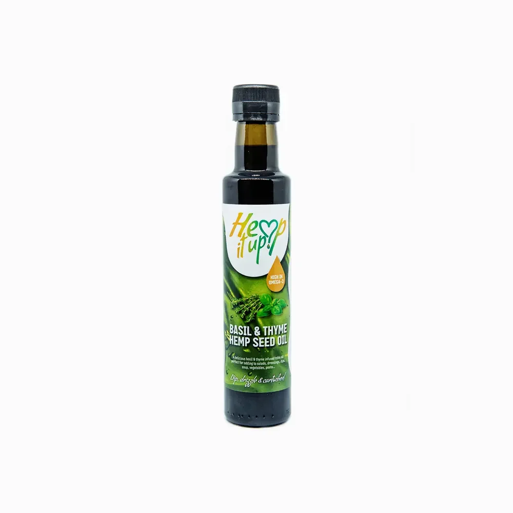 Basil & thyme-infused hemp seed oil is a potent elixir of 3 natural ingredients Hemp seed oil is rich in omega-3, 6 & 9 fatty acids, supports heart health and promotes glowing skin. Basil brings antioxidant and anti-inflammatory properties, boosting immunity and digestion. Meanwhile, Thyme brings antimicrobial and respiratory benefits, creating a nutrient-dense, multi-purpose oil, perfect for drizzling over salads, mozzarella and bruschetta or even massaging into the skin; a powerhouse of natural goodness.